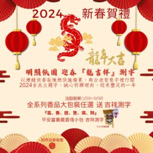 - 明照祇園 煙供餗供 積福迎春 『龍吉祥』測字招福在新春的喜福中,以古老智慧的吉祥測字,透過煙餗供的香氛,點燃祈願迴向的種子。為您的2024年描繪出幸運的主題。每一次供施迴向,不僅是對美好生活的祈福,更是透過吉祥測字,將順利與祝願的種子播撒於您全年的每一刻,共迎吉兆與豐足的龍年
