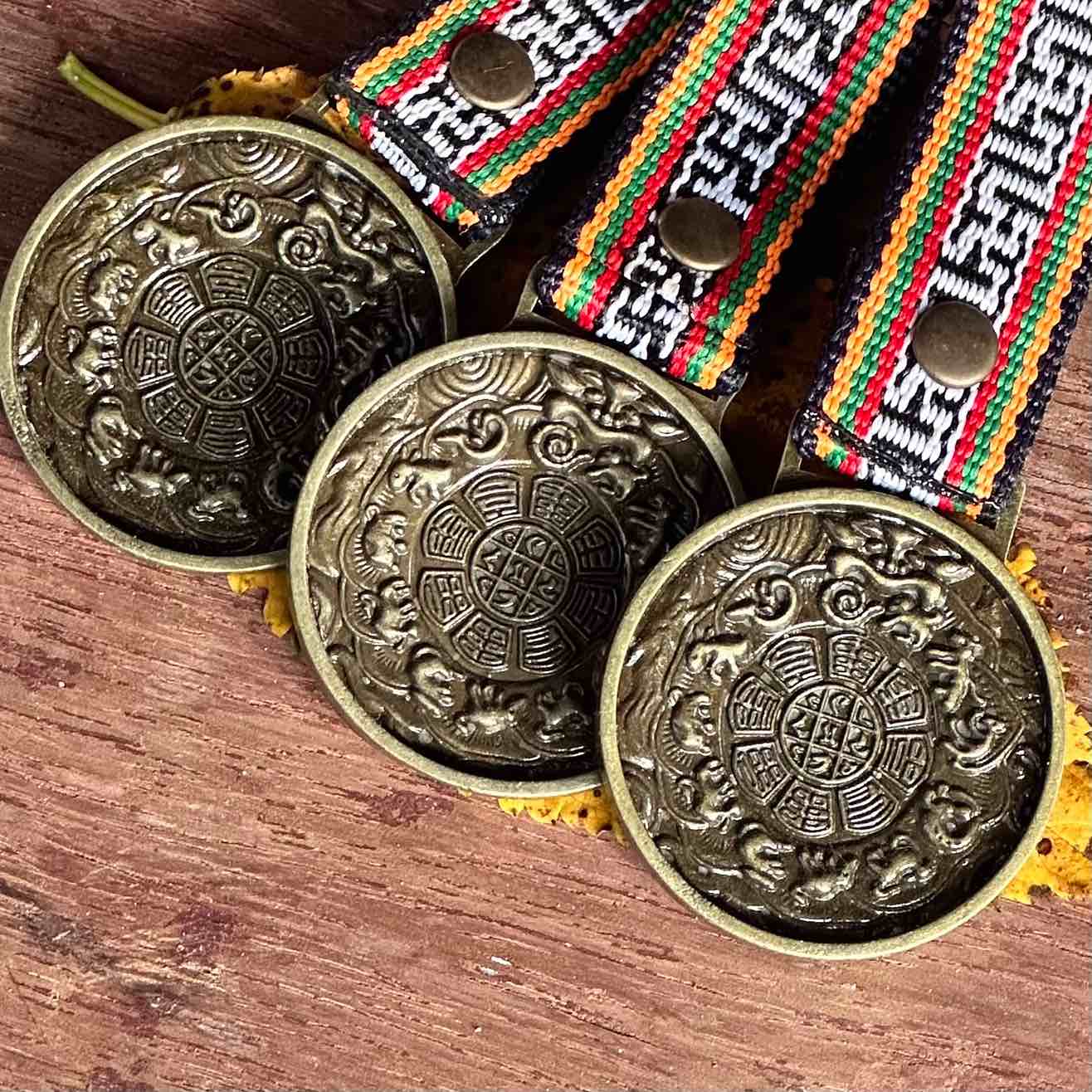 正面九宮八卦:包含『九宮、八卦、五行與十二生肖』,象徵宇宙萬有之和合。藏傳佛教中為降魔伏妖、驅邪護佑的聖物,亦常用於法會與道教民俗儀式。中央九宮、八卦蓮瓣、十二生肖與三怙主菩薩。安置此圖可趨吉避凶、轉禍為福,護佑平安,增長福壽。