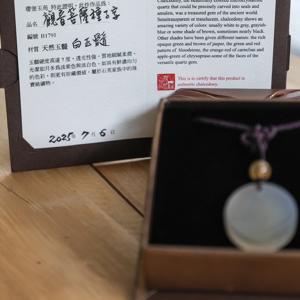 7月6日尊貴的達賴喇嘛尊者90歲壽誕,第一只玉珮恭敬落款。預計在2025年12月「第三屆密集行-勝法盛宴」,觀音灌頂法會開光加持,開放請購法友將觀音種子字 hrīh 白玉髓玉珮,帶至法會現場,領受加持,所有請購玉珮的收入將全數供養法會。
