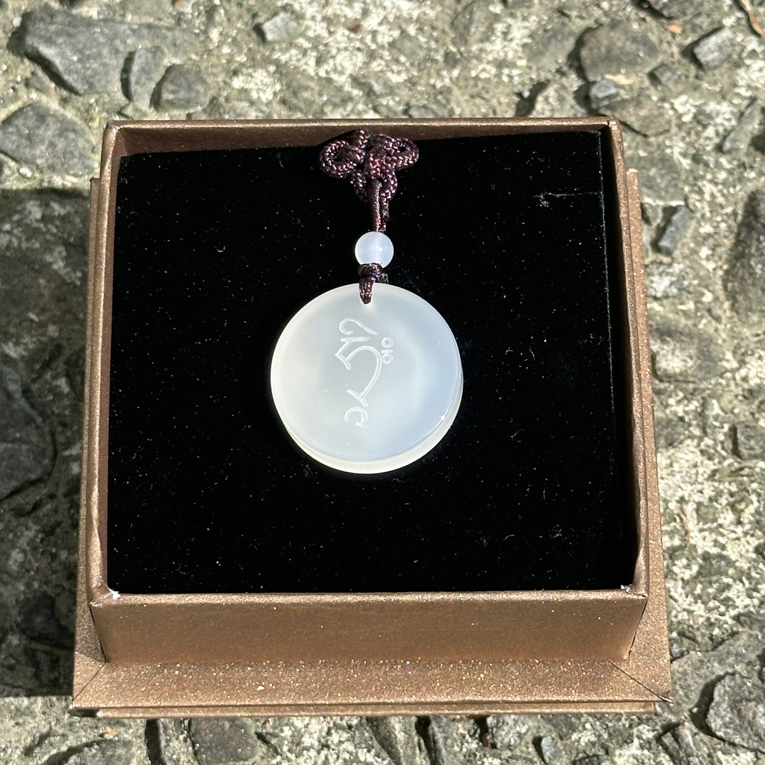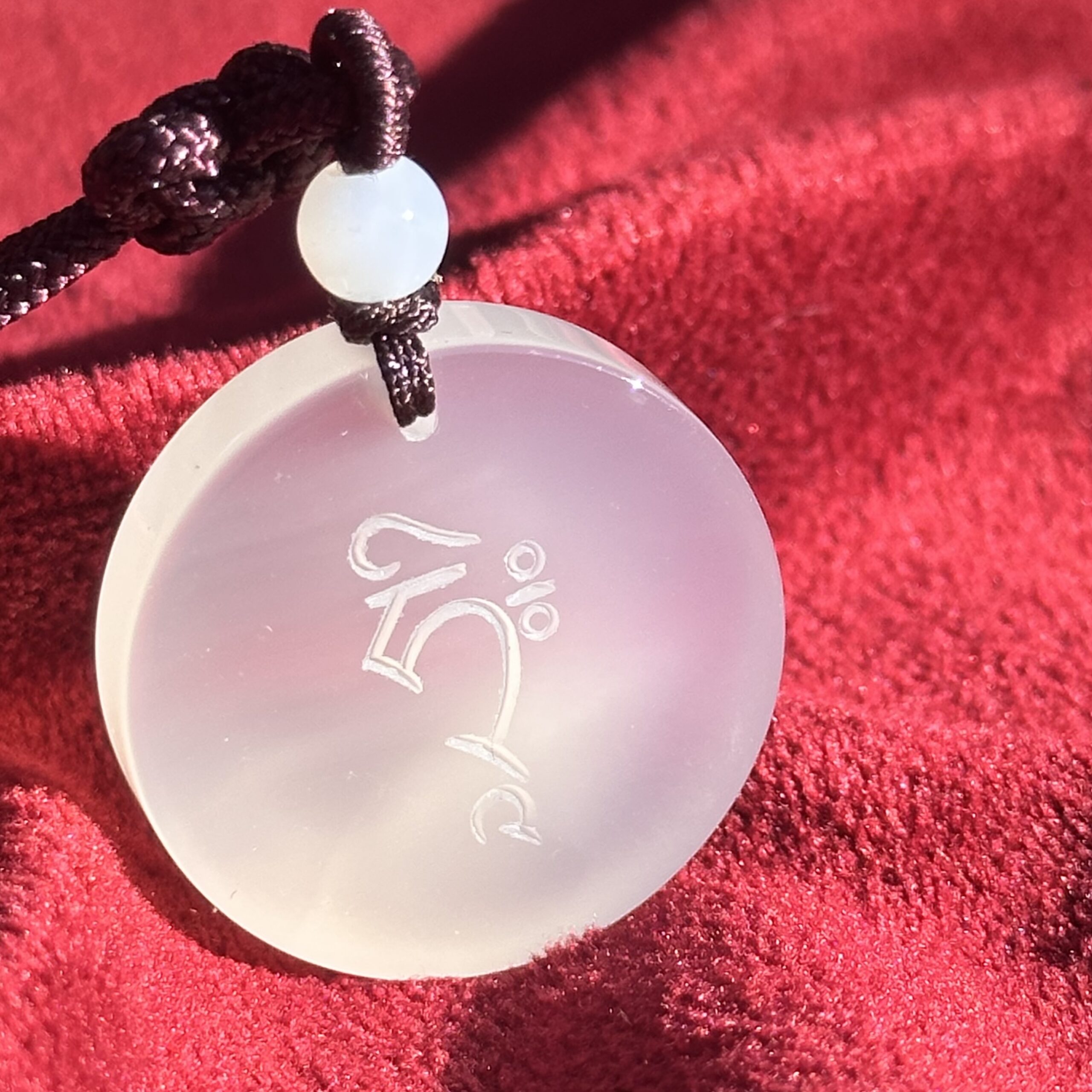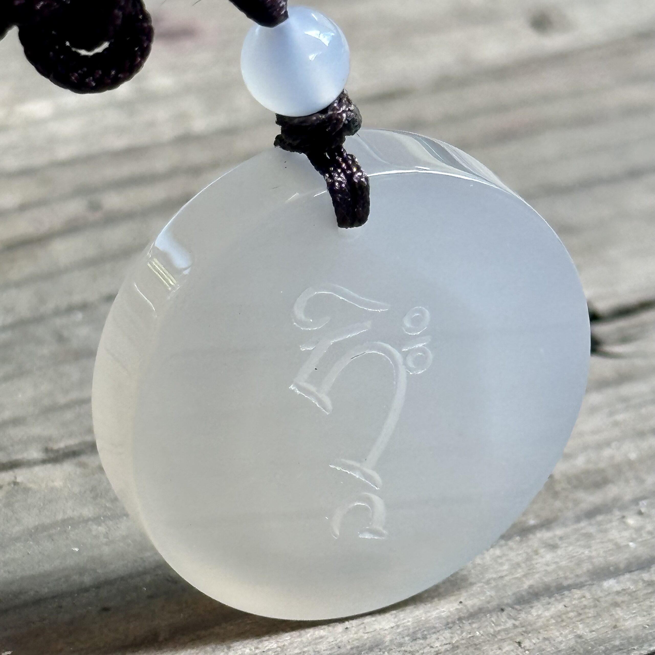 Hand-carved from luminous white chalcedony, this pendant bears the sacred seed syllable of Avalokiteshvara — the embodiment of boundless compassion.
